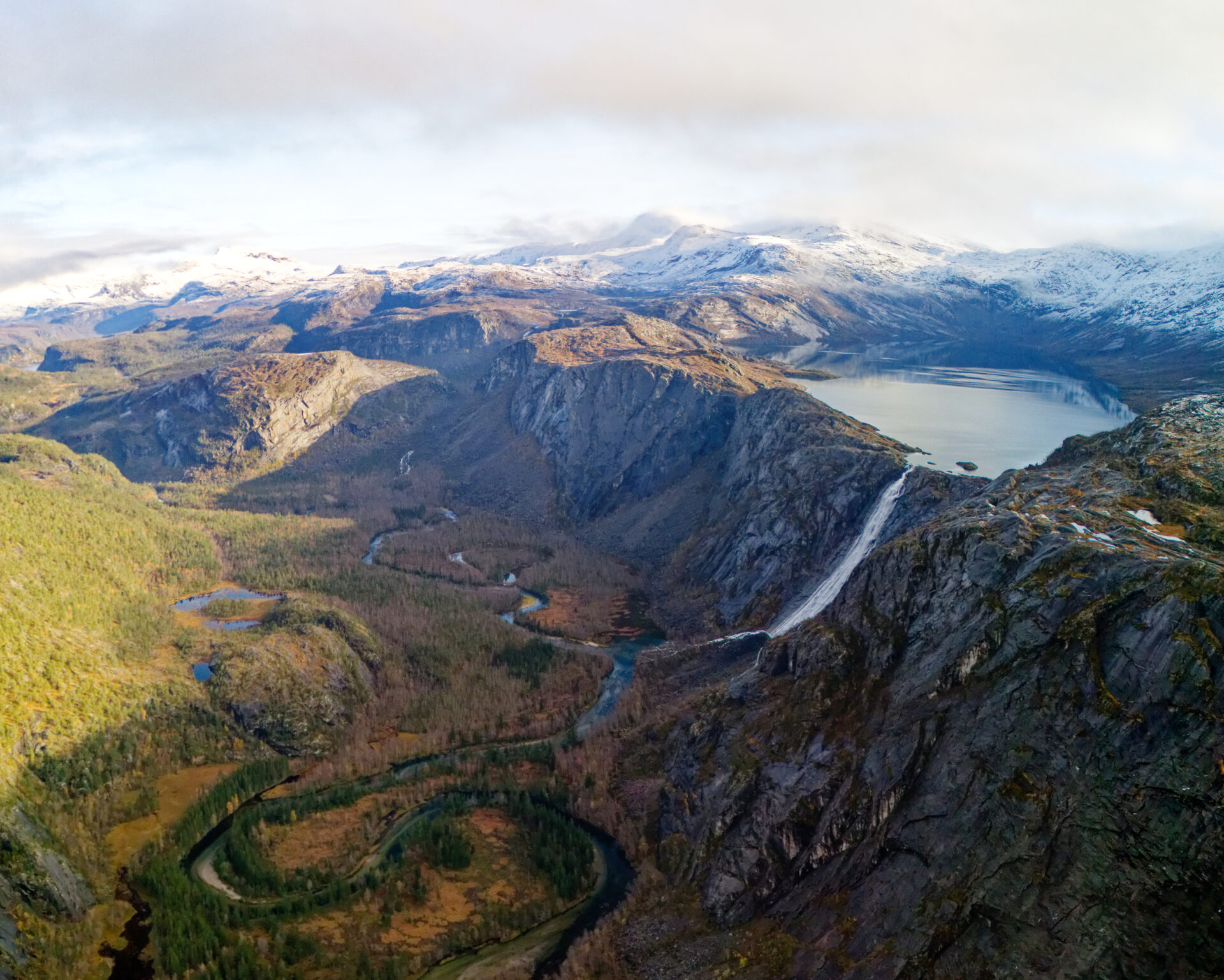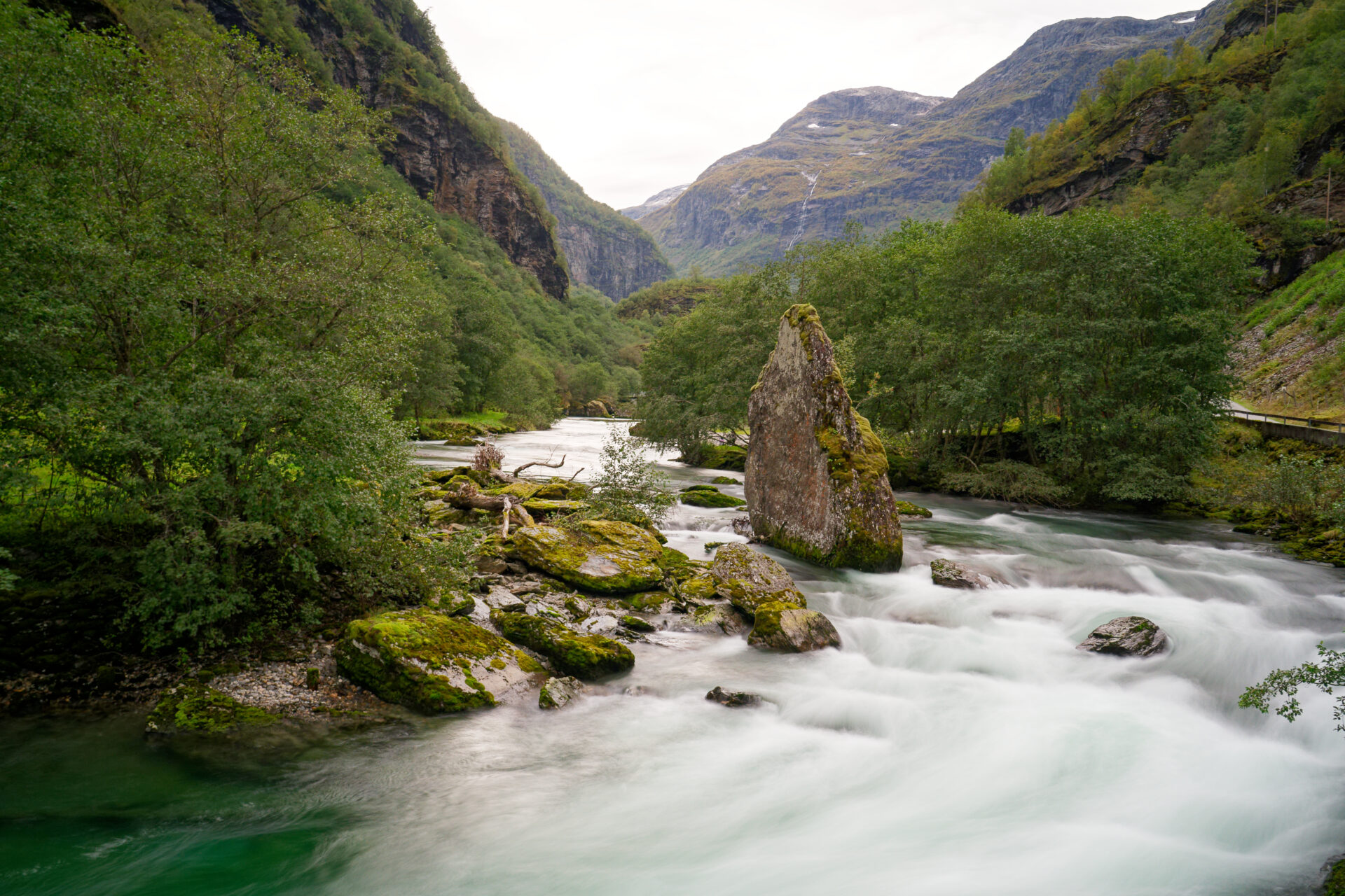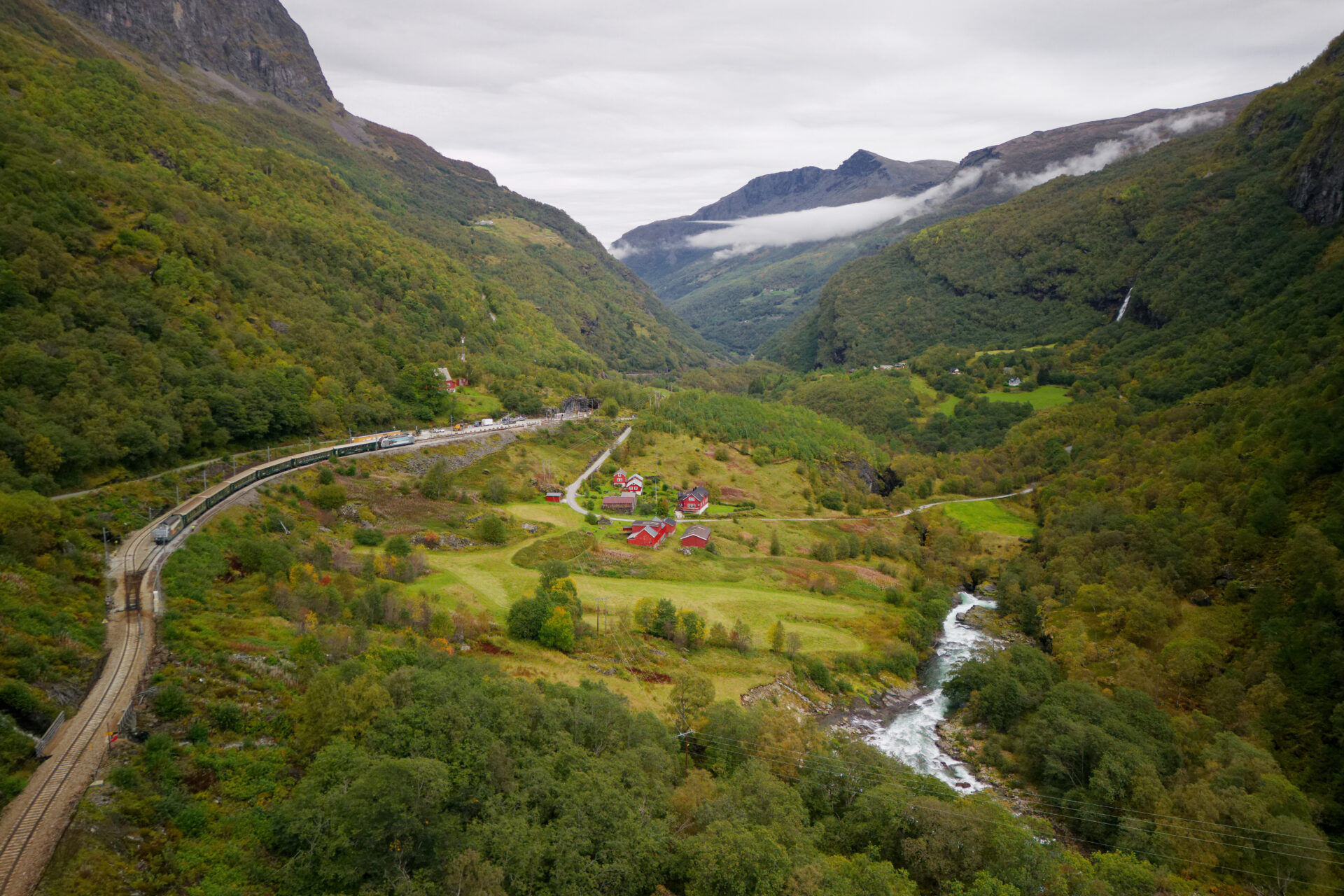 Die Reise beginnt in Bergen, wo wir mit der Fähre anlandeten. Der erste Weg führte uns gleich nach Flåm zu unserer ersten Tour: Wir wollten das Flåmsdalen erkunden. Ein Highlight ist hier die Flåmsbana, eine Eisenbahn von Flåm nach Myrdal, eine ca. 867 Meter hoch gelegene Bahnstation am Westrand der Hochebene Hardangervidda. Hinab geht es zu Fuß entlang das ca. 20km langen Rallarvegen, vorbei an Wasserfällen, Bahnstrecken und Bergbauerhöfe.