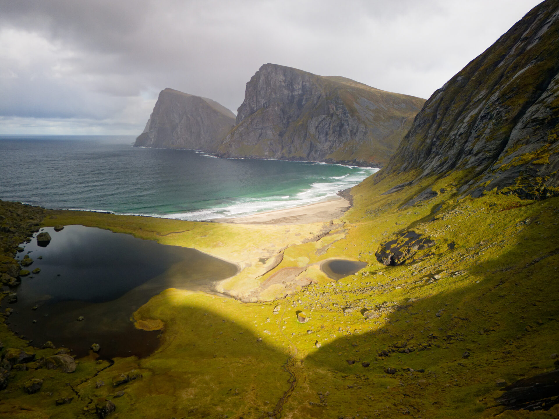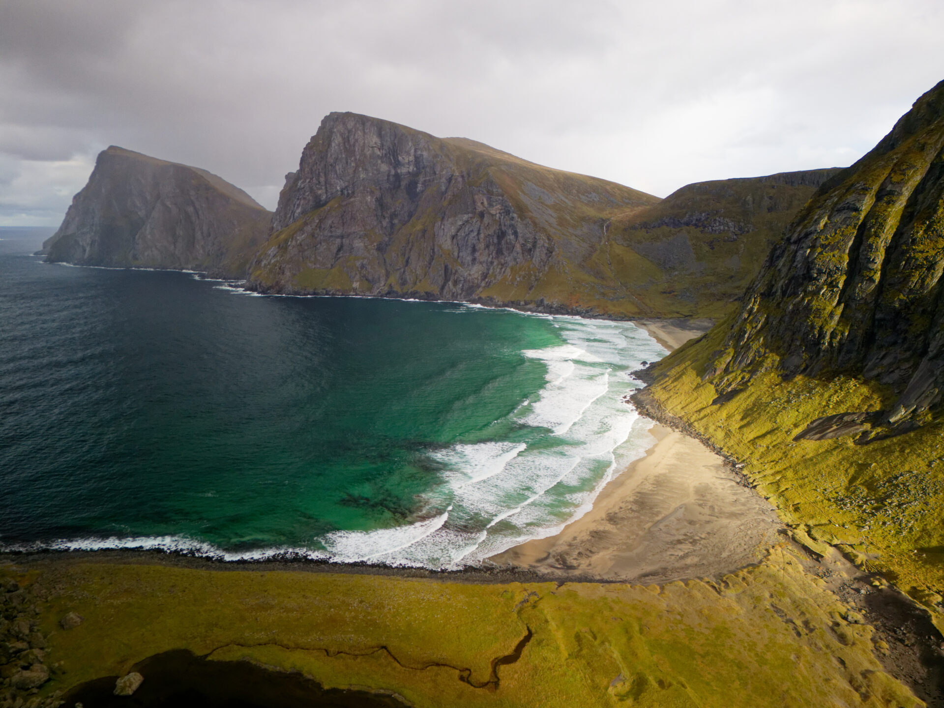 Eingerahmt von steilen Bergen und nur zu Fuß erreichbar, liegt Kvalvika wie ein geheimes Paradies an der wilden Nordmeerküste. Der goldene Sand, das türkisfarbene Wasser und die tosende Brandung machen den Strand zu einem der spektakulärsten Orte Norwegens. Leider konnten wir aufgrund der Brandung nocht vin der Vestervika zur Nordvika übersetzen und wir mussten umkehren. Die Tour war dennoch ein Highlight.