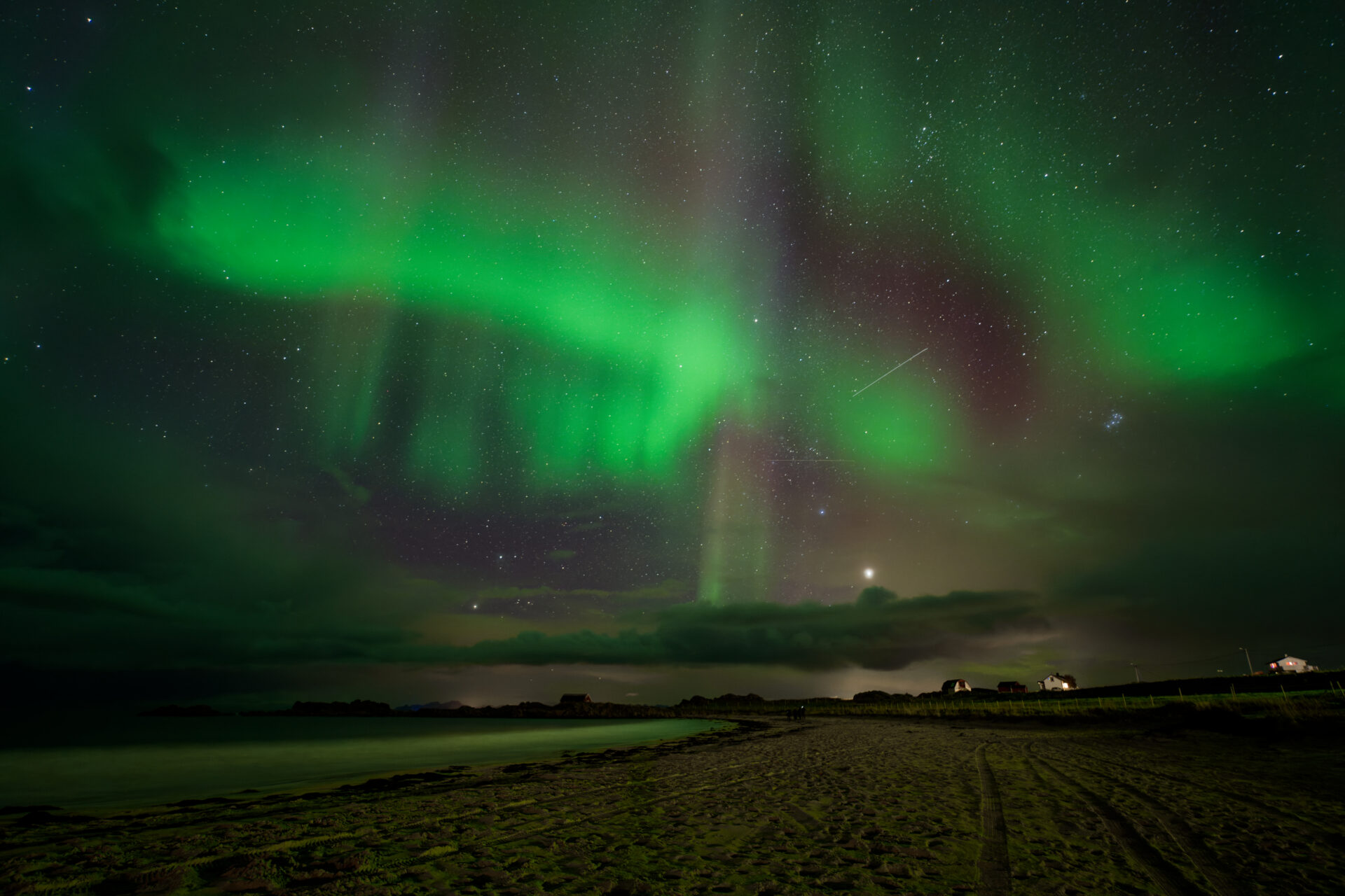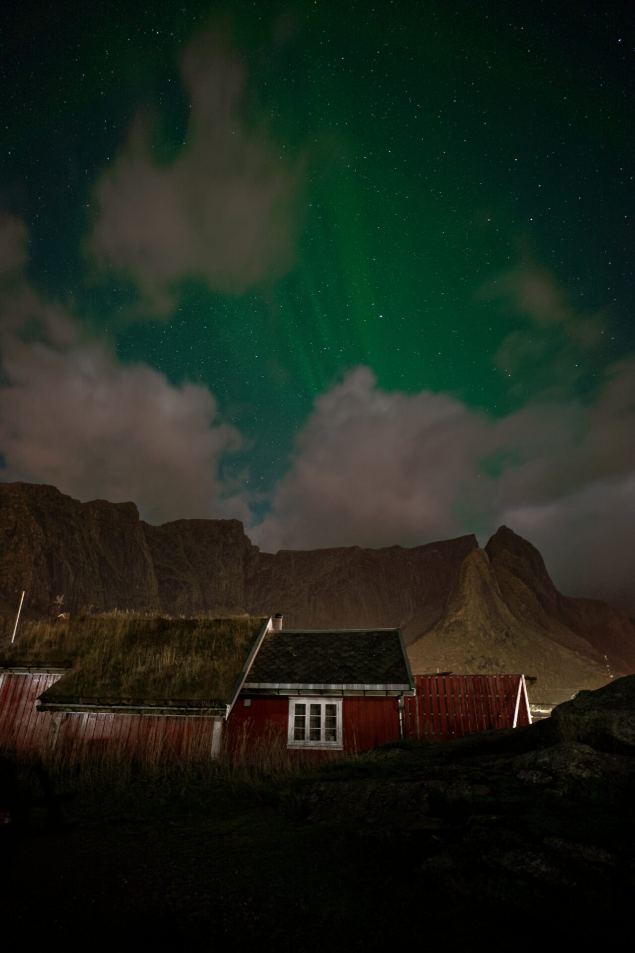 Das Wetter wurde schlechter und die unsere geplante Hoven-Tour viel starkem Regen und Wind zum Opfer. Der Hoven ragt wie eien Haifischflosse über die Insel Gimsøya auf. Dafür hatten wir über Nacht aber viel Glück mit den Nordlichtern, die auf einen halbwegs freien Himmel trafen.