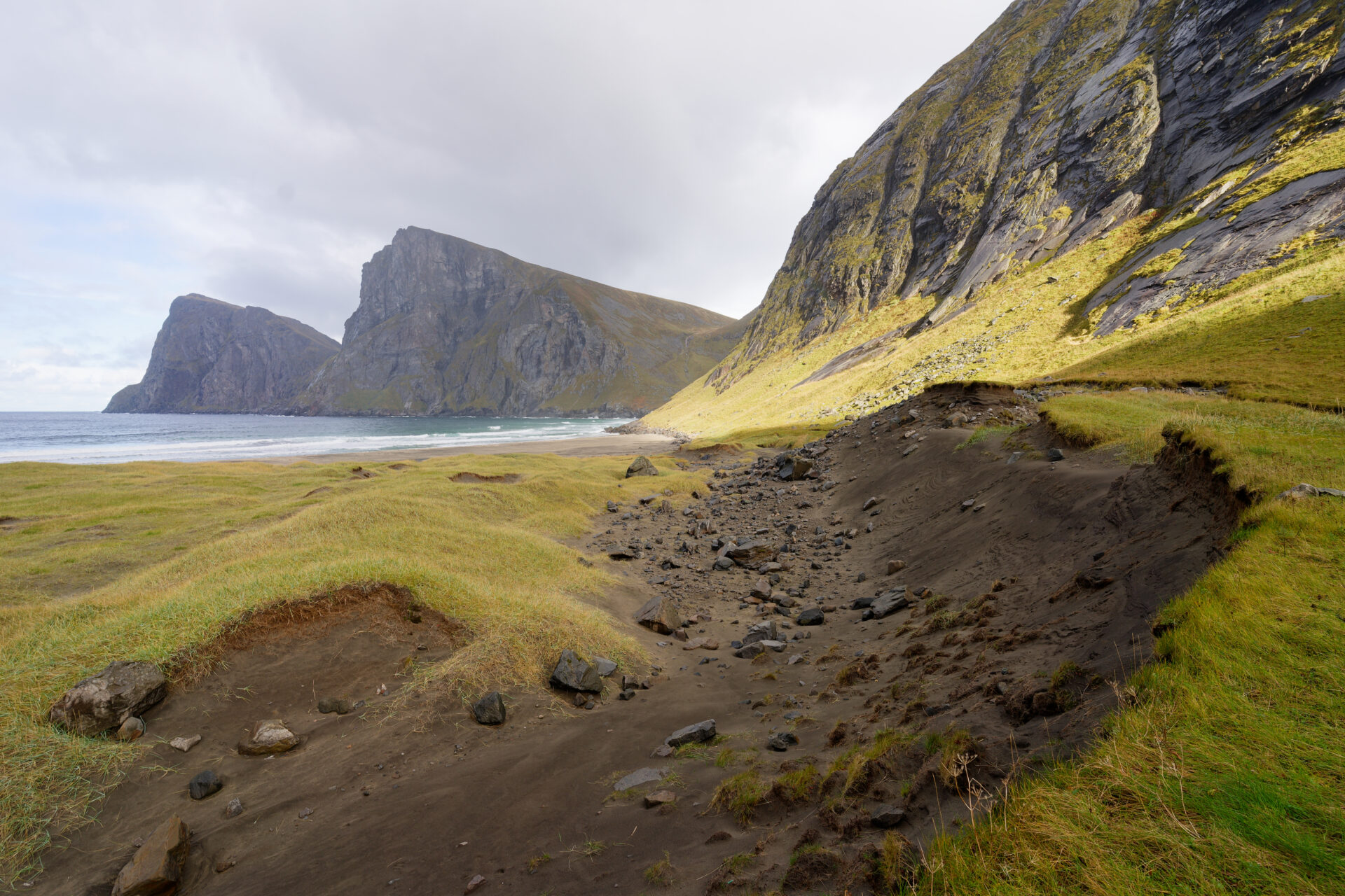 Der historische Fiskersti verbindet das kleine Dorf Nesland mit dem UNESCO-geschützten Nusfjord – einst ein wichtiger Fußweg für Fischer. Heute führt er Wanderer auf rund 5 Kilometern entlang zerklüfteter Felsen, vorbei an Brandung, Vogelklippen und einsamen Buchten. Er ist ein authentischer Küstenpfad, auf dem man spürt, wie das Meer und der Wind das Leben hier prägen. So hatten wir selbst bei gutem Wetter mit auf den schlammigen Pfaden zu kämpfen. Am Ende wartet Nusfjord mit seinen roten Rorbuer und einer Reise in Norwegens Fischervergangenheit.